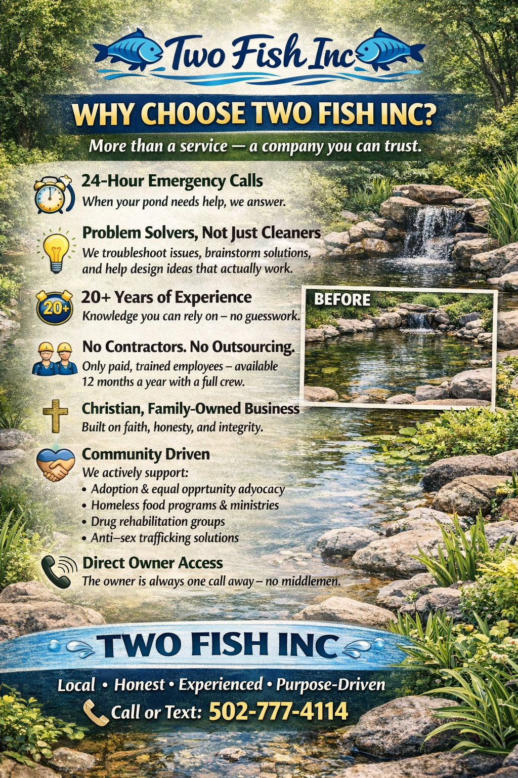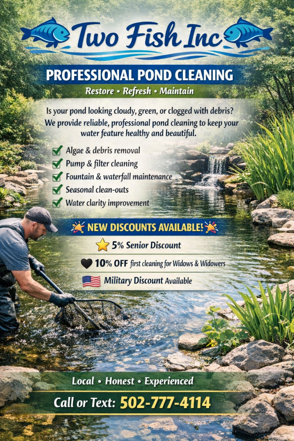 Are you searching for professional pond services in the Louisville and Jeffersontown, KY areas? End your search with Two Fish Inc. We provide koi pond installations and comprehensive pond services to bring tranquility and beauty to your outdoor space.